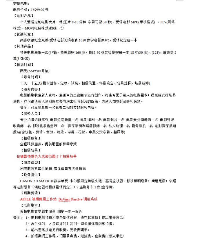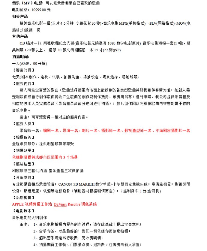 根据微电影的分类,套系内容如下: